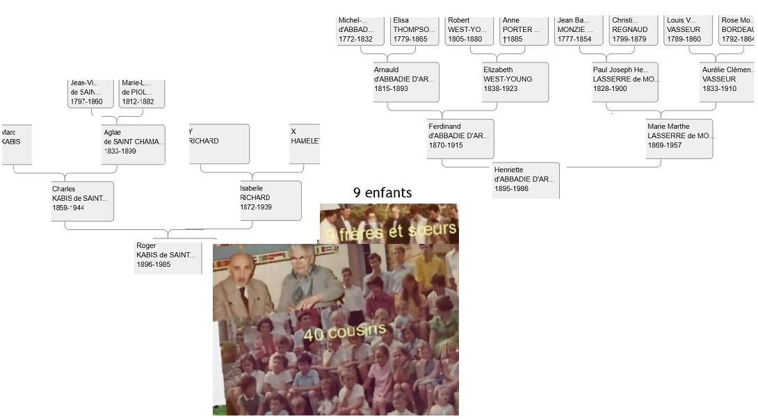 Son fils, Henry Lasserre de Monzie qui retrouve miraculeusement la vue, écrit donc un livre sur les Apparitions de la Vierge à Bernadette Soubirous, et épouse en 1868 Aurélie Vasseur (1833 1910) qui transmettront la vie à Marthe en 1869, morte en 1957. Arnauld d’Abbadie d’Arrast, 1815-1893, explorateur en Éthiopie, marié à Elisabeth West Young 1840-1923 (Américaine de souche Anglaise), auront des enfants dont Ferdinand né en 1870 qui va épouser cette Marthe et, s'engageant en 1914 dans l'armée Anglaise, serait disparu vers 1915 ...